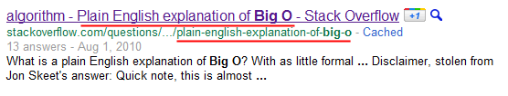 /questions/{id}/{title} as in http://stackoverflow.com/questions/487258/plain-english-explanation-of-big-o