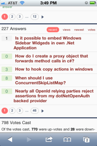 One cool trick with this approach is that anywhere you render an action (as with @Html.Action() in a razor view) will also get the mobile treatment. Take a look at a Stack Overflow user page to see this sort of behavior in action. Each of those paged subsections (Questions, Answers, and so on) is rendered inline as an action and then ajax’d in via the same action. In fact, since the paging code on the user page merely fetches some HTML and writes it into the page (via jQuery, naturally) we’re able to use exactly the same javascript on the desktop user page and the mobile one.