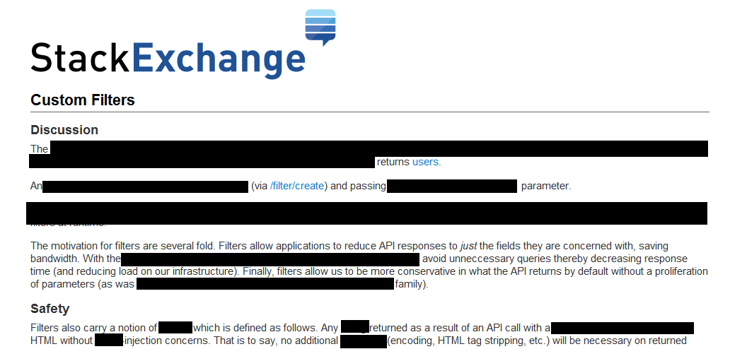 Posted: 2012/01/06 Filed under: pontification | Tags: apiv2 Comments Off on Stack Exchange API V2.0: FiltersWe’re underway with the 2.0 version of the Stack Exchange API, so there’s no time like the present to get my thoughts on it written down. This is the first in a series of nine posts about the additions, changes, and ideas in and around our latest API revision. I’m sharing details because I think they’re interesting, but not with the expectation that everything I talk about will be generally applicable to other API designers.