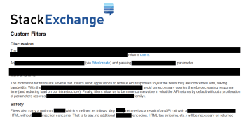 Filters take the form of an opaque string passed to a method which specifies which fields you want returned. For example, passing “!A7x.GE1T” to /sites returns only the names of the sites in the Stack Exchange network (this is a simplification, more details when we get to implementation). This is similar to, but considerably terser than, partial returns via the “fields” parameter as implemented by Facebook and Google (note that we do allow something similar for key-less requests via the “include” and “exclude” parameters).