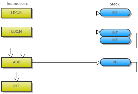 We know “ldc.i4” consumes nothing, and produces an int, “add” actually consumes and produces a wide range of types but one of them is “int int -> int”. The “ret” instruction either consumes nothing or a single type, dependent on the signature of the method it is used in; in this case it consume an “int” which we know because the method is a “Func<int>”.