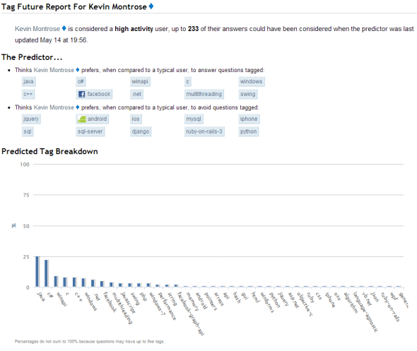 Stated more formally: what we wanted was an algorithm that when given a user and their activity on Stack Overflow to date, predicted for each tag what percentage of their future answers would be on questions in that tag. “Percentage” is a tad mislead since each question on Stack Overflow can have up to five tags, so the percentages don’t sum to anything meaningful.