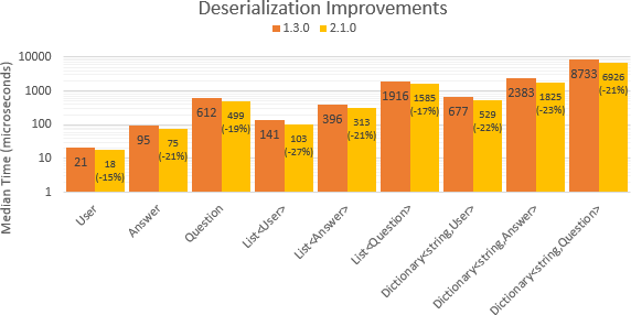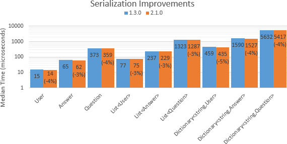 Overall serialization gains fall around 1% for the Stack Exchange API types, with the larger models and collections gaining a bit more.
